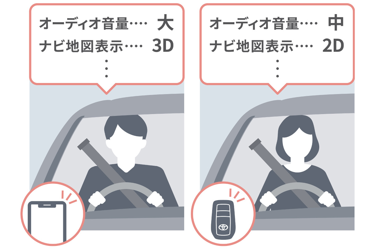 ご家族でクルマをシェアするときなど、個々のよく使うオーディオやナビの地図表示など運転する方のお好みの車両設定を記録。乗車の際、事前に登録したスマートキーやスマートフォン*2で運転者を認識し、ドライバーそれぞれの最適な車内環境に自動で設定します。