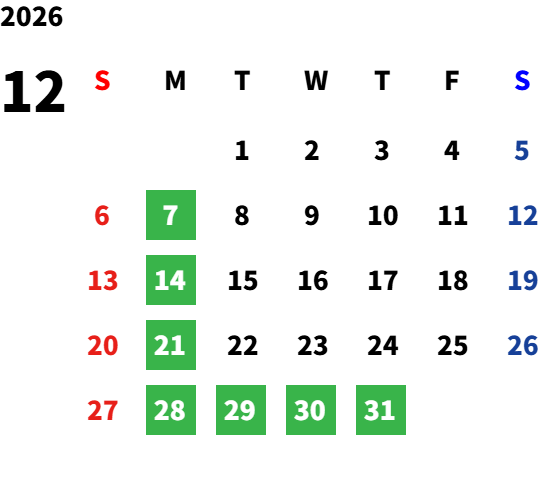 2025年12月29日(月)~2026年1月5日(月):一斉 休業