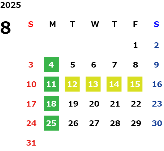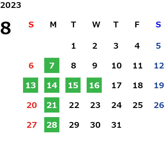 ※毎週月曜日は定休日、8月11日〜15日は夏季休業となります。